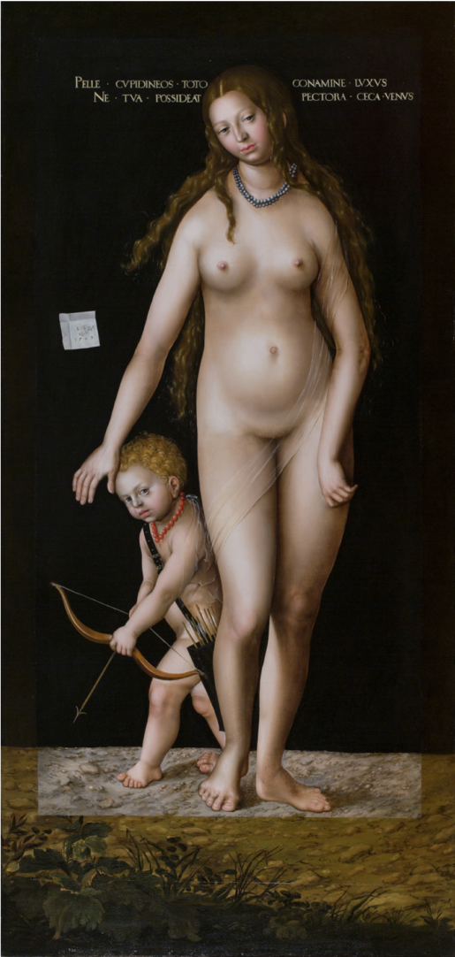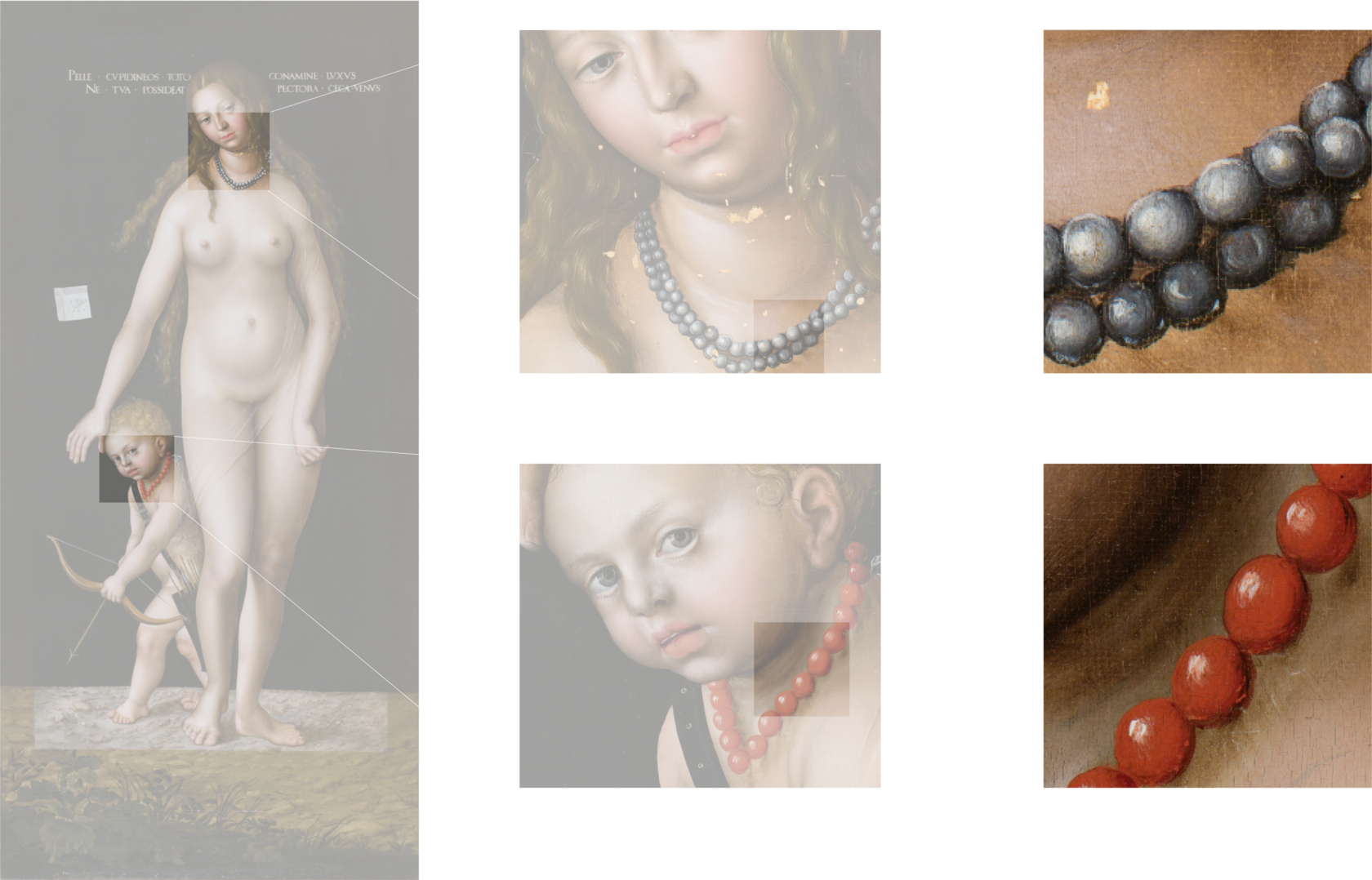 Одним из символов Венеры является жемчуг. На картине Кранаха у Венеры присутствует белое ожерелье, у Амура — карсное.